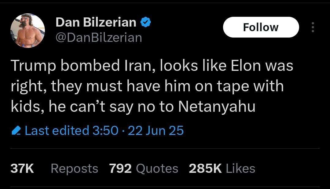 «Թրամփը ռմբակոծել է Իրանը, կարծես թե Իլոնը ճիշտ էր. նա չի կարող մերժել Նեթանյահուին»,- գրել է նա։