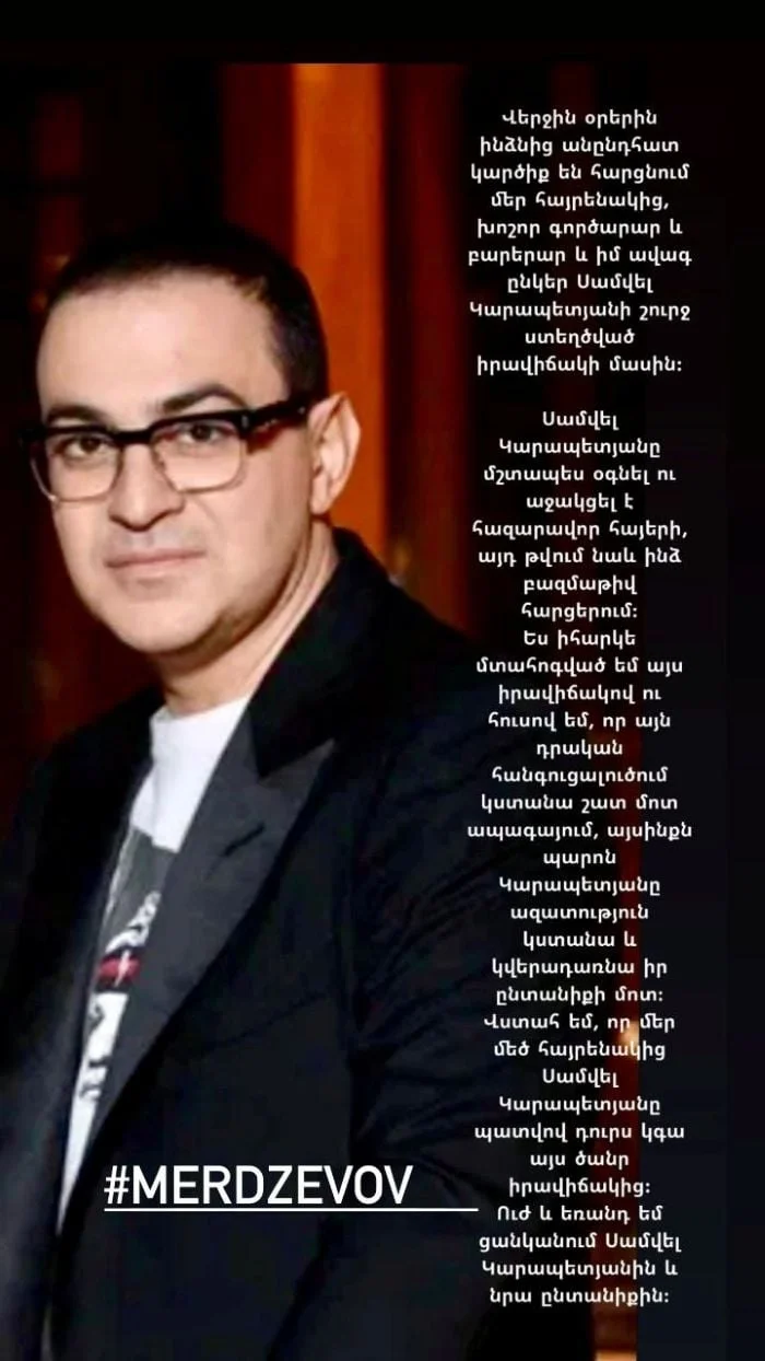 «Վերջին օրերին ինձնից անընդհատ կարծիք են հարցնում մեր հայրենակից, խոշոր բարերար և իմ ավագ ընկեր Սամվել Կարապետյանի շուրջ ստեղծված իրավիճակի մասին։ Սամվել Կարապետյանը մշտապես օգնել ու աջակցել է հազարավոր հայերի,այդ թվում նաև ինձ բազմաթիվ հարցերում։ Ես իհարկե մտահոգված եմ այս իրավիճակով ու հուսով եմ, որ այն դրական հանգուցալուծում կստանա շատ մոտ ապագայում, այսինքն պարոն Կարապետյանը ազատություն կստանա և կվերադառնա իր ընտանիքի մոտ։ Վստահ եմ,որ մեր հայրենակից Սամվել Կարապետյանը պատվով դուրս կգա այս ծանր իրավիճակից։ Ուժ և եռանդ եմ ցանկանում Սամվել Կարապետյանին և նրա ընտանիքին»։