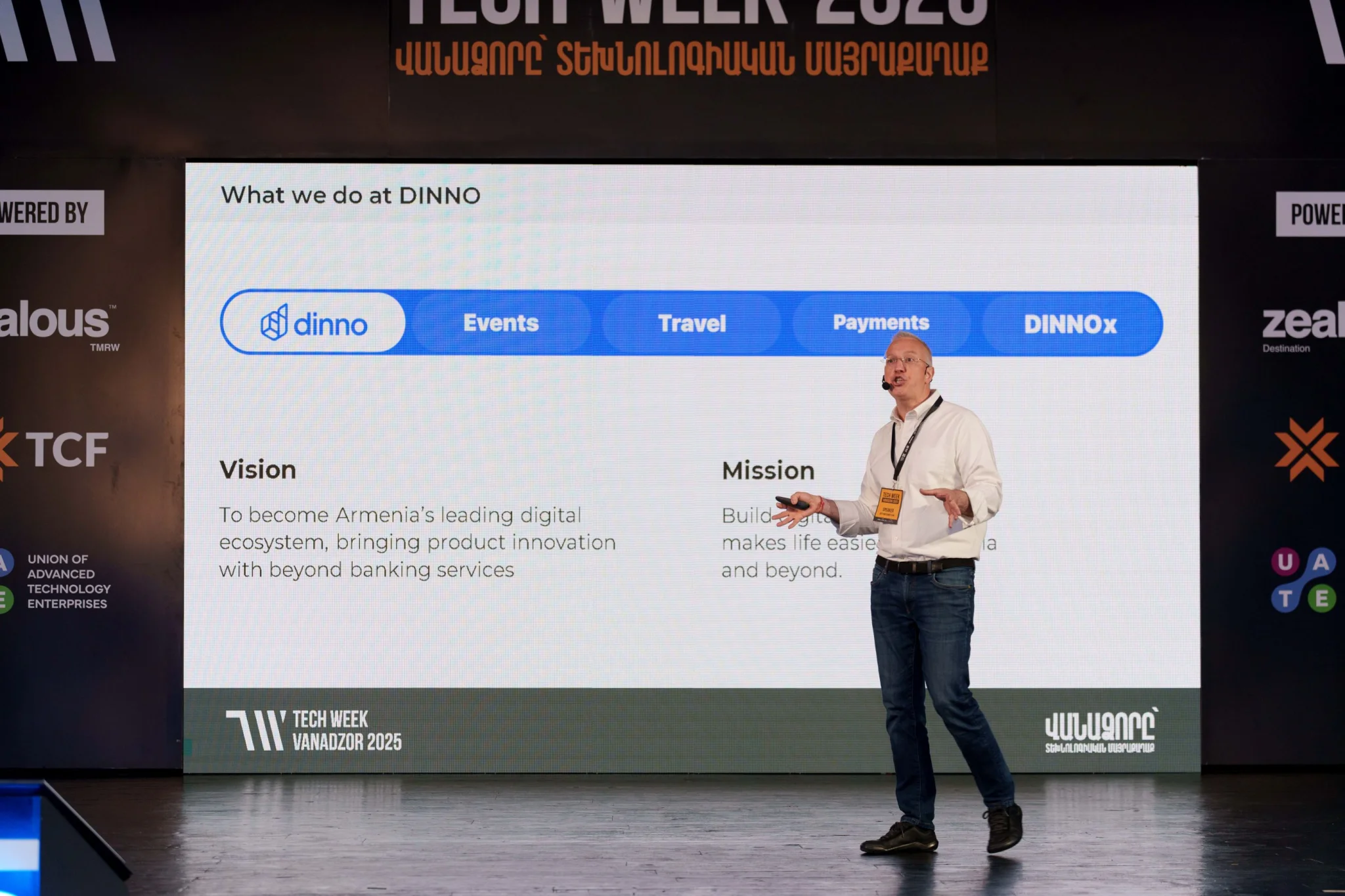 Ամերիաբանկի դուստր ձեռնարկության՝ «Դիննո» ՓԲԸ տնօրեն Արտյոմ Շամցյանն էլ Tech Week-ի շրջանակում կիսվեց ընկերության հաջողության պատմությամբ՝ «DINNO-ի առաջին միլիարդը․ հաջողության ճանապարհի 7 սկզբունքը» խորագրով ելույթում։