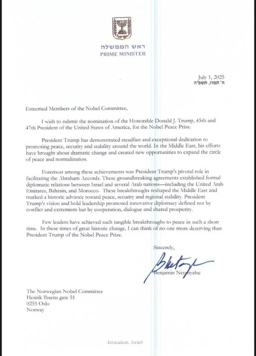 ՏեսանյութերԻսրայելի վարչապետ Բենյամին Նեթանյահուն առաջադրել է ԱՄՆ նախագահ Դոնալդ Թրամփին Խաղաղության Նոբելյան մրցանակի: Այս մասին հայտնում է The Guardian-ը։