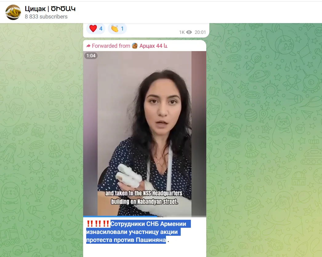 Ադրբեջանական «Haqqin.az» ռուսալեզու կայքը հրապարակել է տեսանյութ, որտեղ մի աղջիկ ասում է, թե իբր Հայաստանի Ազգային անվտանգության ծառայության աշխատակիցները բռնաբարել են իրեն՝ Նիկոլ Փաշինյանի դեմ ցույցերին մասնակցելու համար։ Այս մասին գրում է FIP - Փաստերի ստուգման հարթակը։