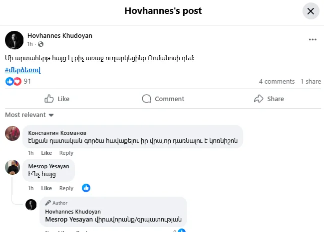 «Մի արտահերթ հայց էլ քիչ առաջ ուղարկեցինք Ռոմանոսի դեմ»,– գրել է նա և մեկնաբանություններում մանրամասնել, որ խոսքը «վիրավորանք/զրպատության» մասին է: