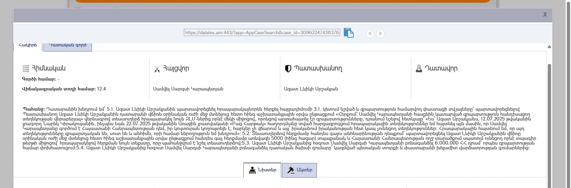 5.4. Ազատ Լևիկի Արշակյանից հօգուտ Սամվել Սարգսի Կարապետյանի բռնագանձել դատական ծախսի գումարը՝ կազմված պետական տուրքի և փաստաբանի խելամիտ վարձատրության գումարներից»,– ասված է պահանջի մեջ։