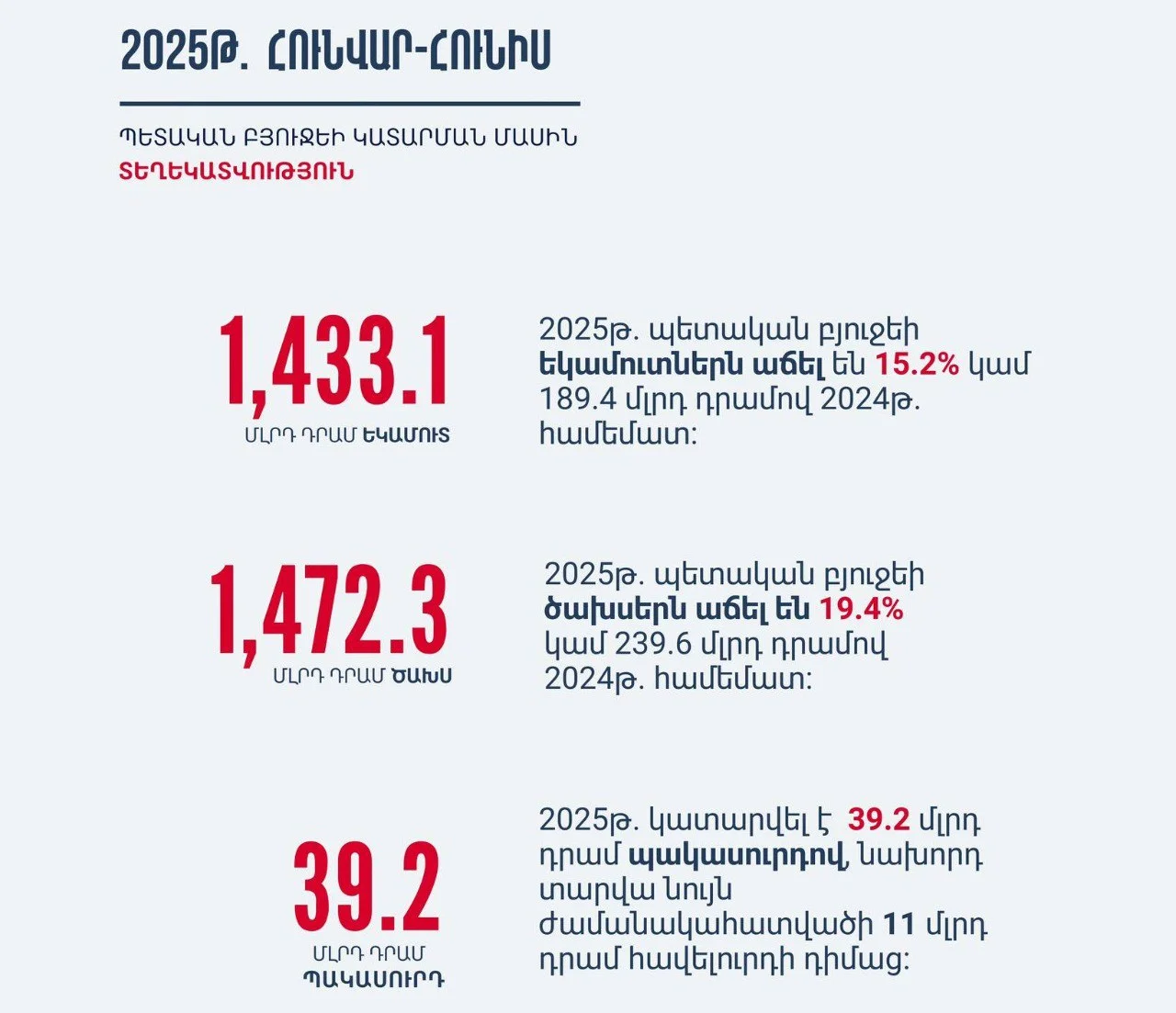 2025 թվականի առաջին կիսամյակի ընթացքում ՀՀ պետական բյուջեն կատարվել է 39.2 մլրդ դրամ պակասուրդով՝ առաջին կիսամյակի համար ծրագրված 325.3 մլրդ դրամ պակասուրդի և նախորդ տարվա նույն ժամանակահատվածի 11 մլրդ դրամ հավելուրդի դիմաց: