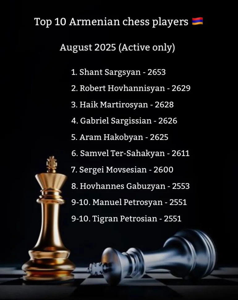 Հայաստանի շախմատի ֆեդերացիան հրապարակել է Հայաստանի 10 լավագույն շախմատիստների և շախմատիստուհիների ցանկը 2025 թվականի օգոստոսի 1-ի դրությամբ: