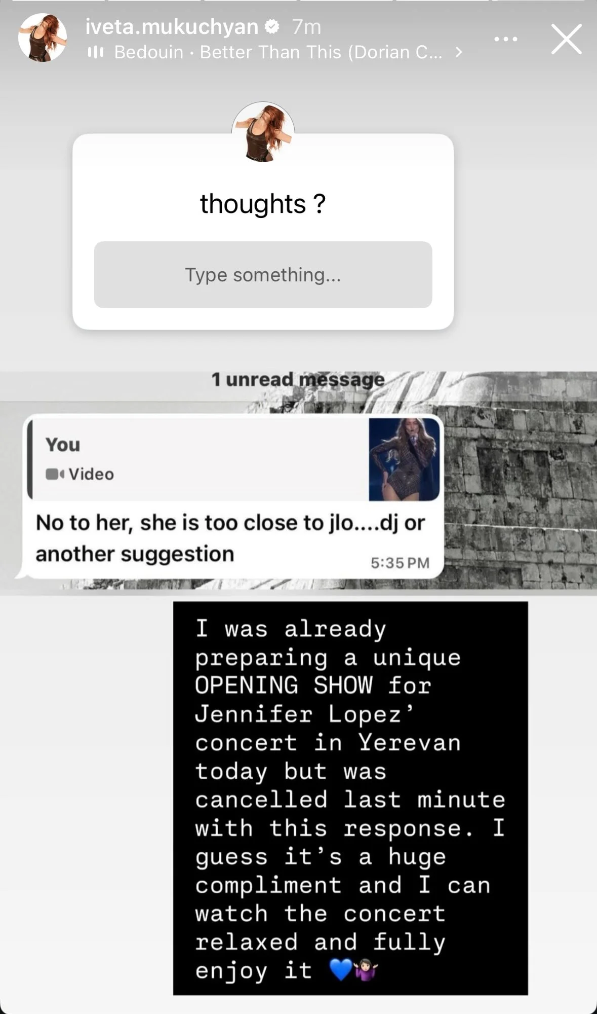 «Ես արդեն եզակի բացման շոու էի նախապատրաստում Ջենիֆեր Լոպեսի երևանյան համերգի համար, բայց իմ ելույթը վերջին պահին չեղարկեցին այսպիսի պատասխանով: Ես կարծում եմ՝ սա մեծ գնահատական է, իսկ ես համերգը կվայեմ ամբողջովին հանգիստ վիճակում»,– գրել է Իվետան: