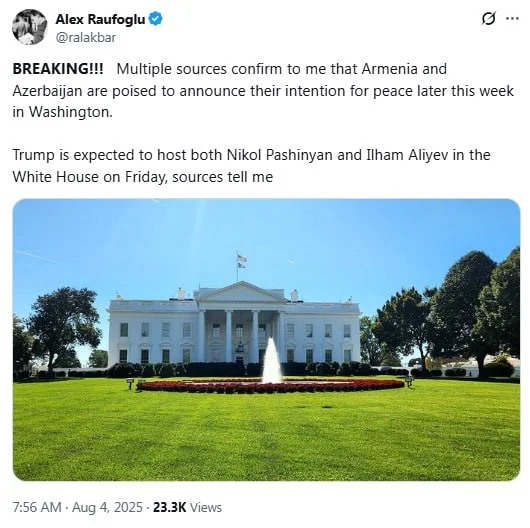 Թրամփն ուրբաթ օրը Սպիտակ տանը կընդունի Փաշինյանին և Ալիևին․ աղբյուր
