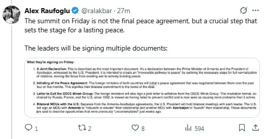 Ադրբեջանական տեղեկատվական տիրույթում լուրեր են տարածվել, թե Սպիտակ տանը Փաշինյան-Թրամփ-Ալիև հանդիպմանը ստորագրվելու են մի քանի փաստաթղթեր։ Այս մասին տեղեկություն է տարածել լրագրող Ալեքս Ռուֆօղլուն՝ X-ի իր էջում։