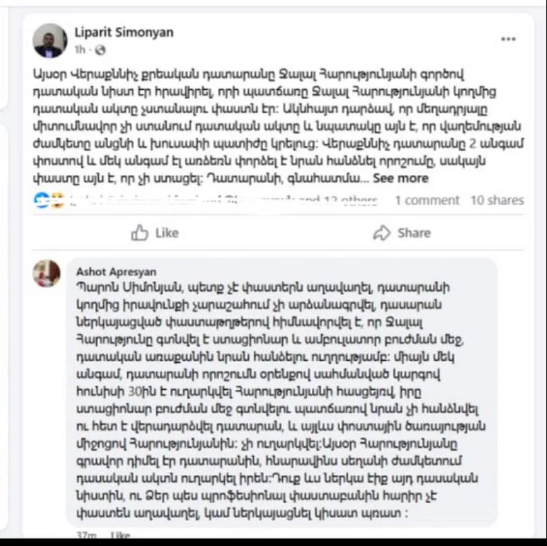Այսօր Հարությունյանը գրավոր դիմել էր դատարանին՝ հնարավորինս սեղմ ժամկետում դատական ակտն ուղարկել իրեն։ Դուք ևս ներկա էիք այդ դատական նիստին, ու Ձեր պես պրոֆեսիոնալ փաստաբանին հարիր չէ փաստեն աղավաղել, կամ ներկայացնել կիսատ-պռատ»,- Ջալալ Հարությունյանի գործով տուժողների իրավահաջորդների ներկայացուցիչ Լիպարիտ Սիմոնյանին արձագանքել է Ապրեսյանը։