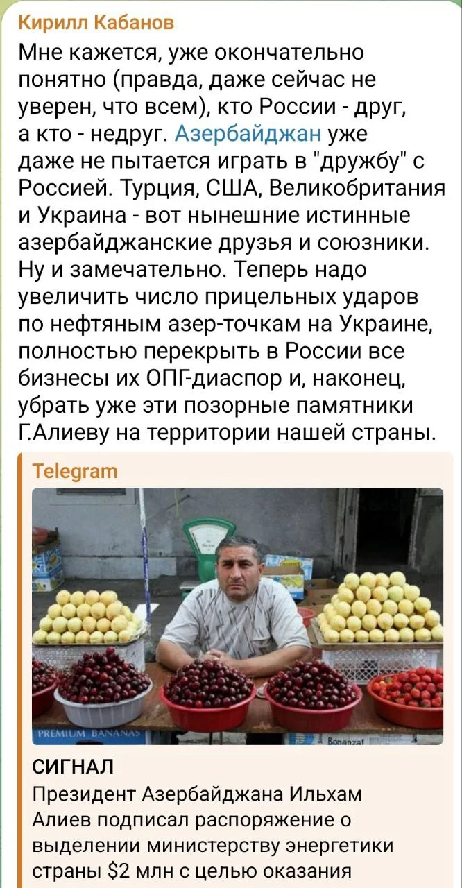Ռուսաստանի Դաշնության Ազգային հակակոռուպցիոն կոմիտեի նախագահ Կիրիլ Կաբանովը իր տելեգրամյան ալիքում առաջարկել է թիրախային հարվածներ հասցնել Ուկրաինայում գտնվող Ադրբեջանի հետ կապված նավթային օբյեկտներին, ինչպես նաև լիովին դադարեցնել ադրբեջանական սփյուռքի հետ կապ ունեցող կազմակերպված հանցավոր խմբերի գործունեությունը ռուսական բիզնեսում և ազատվել Հեյդար Ալիևի հուշարձաններից։