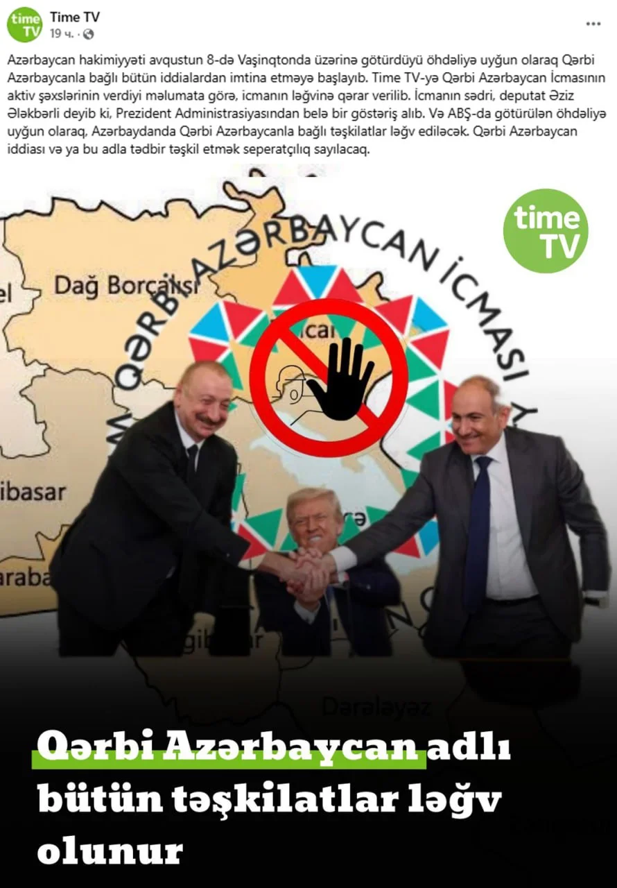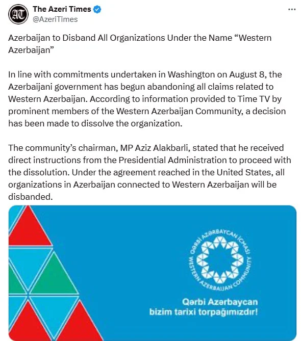 Ադրբեջանական պետական լրատվամիջոցները տարածել են «Արևմտյան Ադրբեջանի համայնք» կեղծ կազմակերպության խորհրդի «նախագահ» Ֆունտա Ազիզ Ալեքբարլիի հայտարարությունը, ըստ որի՝ այն տեղեկությունները, թե «Ադրբեջանը սկսել է լուծարել այսպես կոչված՝ «Արևմտյան Ադրբեջանի» հետ կապված կազմակերպությունները, բացարձակ կեղծիք են և այդ տեղեկությունները գալիս են Հայաստանից»։