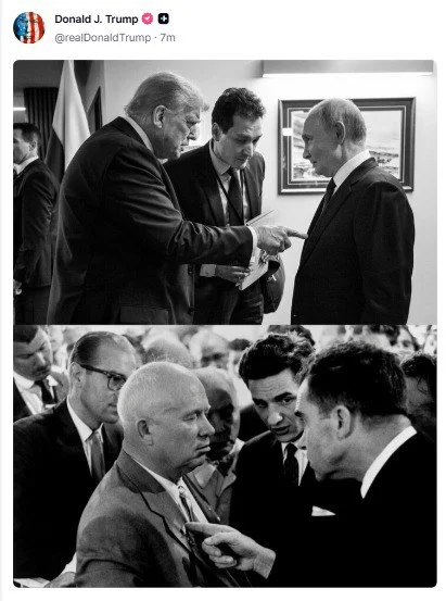 ԱՄՆ նախագահ Դոնալդ Թրամփը սոցցանցում համեմատական նկարներ է հրապարակել Ռուսաստանի նախագահ Վլադիմիր Պուտինի հետ Ալյասկայում իր հանդիպման և ԽՄԿԿ Կենտկոմի առաջին քարտուղար Նիկիտա Խրուշչովի և ԱՄՆ առաջնորդ Ռիչարդ Նիքսոնի հանդիպման լուսանկարը Մոսկվայում 1959 թվականին, երբ նա դեռ փոխնախագահ էր։
