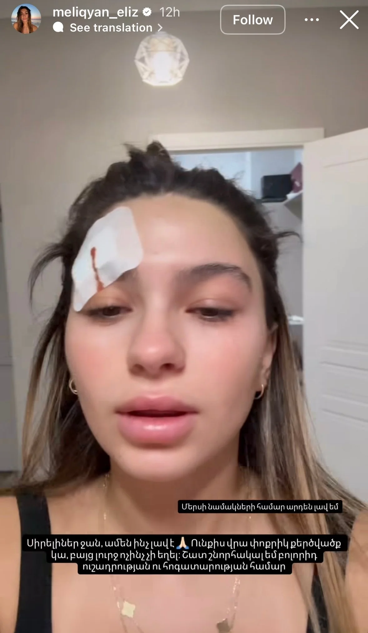 «Սիրելիներ ջան, ամեն ինչ լավ է: Ունքիս վրա փոքրիկ քերծվածք կա, բայց լուրջ ոչինչ չի եղել»,-տեղեկացրել է նա: