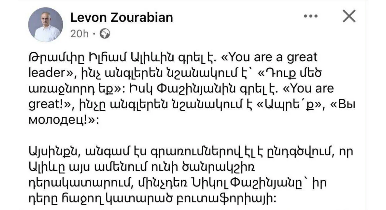 Իսկ բառիս բուն իմաստով «լուզերները» էսօրվա ձեր կառավարությունն ա, որի մասին Նիկոլը, բոլորիդ տրորելով, ասել ա` «կառավարություն ես եմ» ու ճիշտ ա ասել, որը, տանուլ տալով Արցախը և Հայաստանի սուվերեն տարածքի 200 քառակուսի կիլոմետր, հիմա էլ խոստանալով 99 տարով «արտապատվիրակել» նաև «Զանգեզուրի միջանցքը», դարձել է Հայաստանի պարտության և նվաստացման հավերժական խորհրդանիշը»: