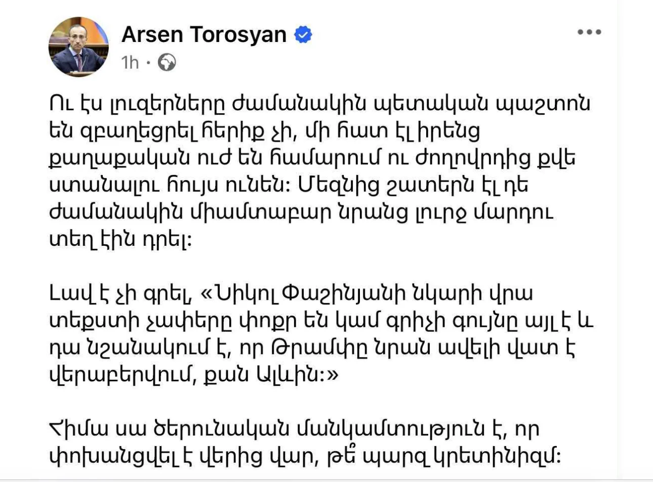 ՀԱԿ փոխնախագահ Լևոն Զուրաբյանը՝ անդրադառնալով Սոցապ նախարար Արսեն Թորոսյանի գրառմանը գրում է․