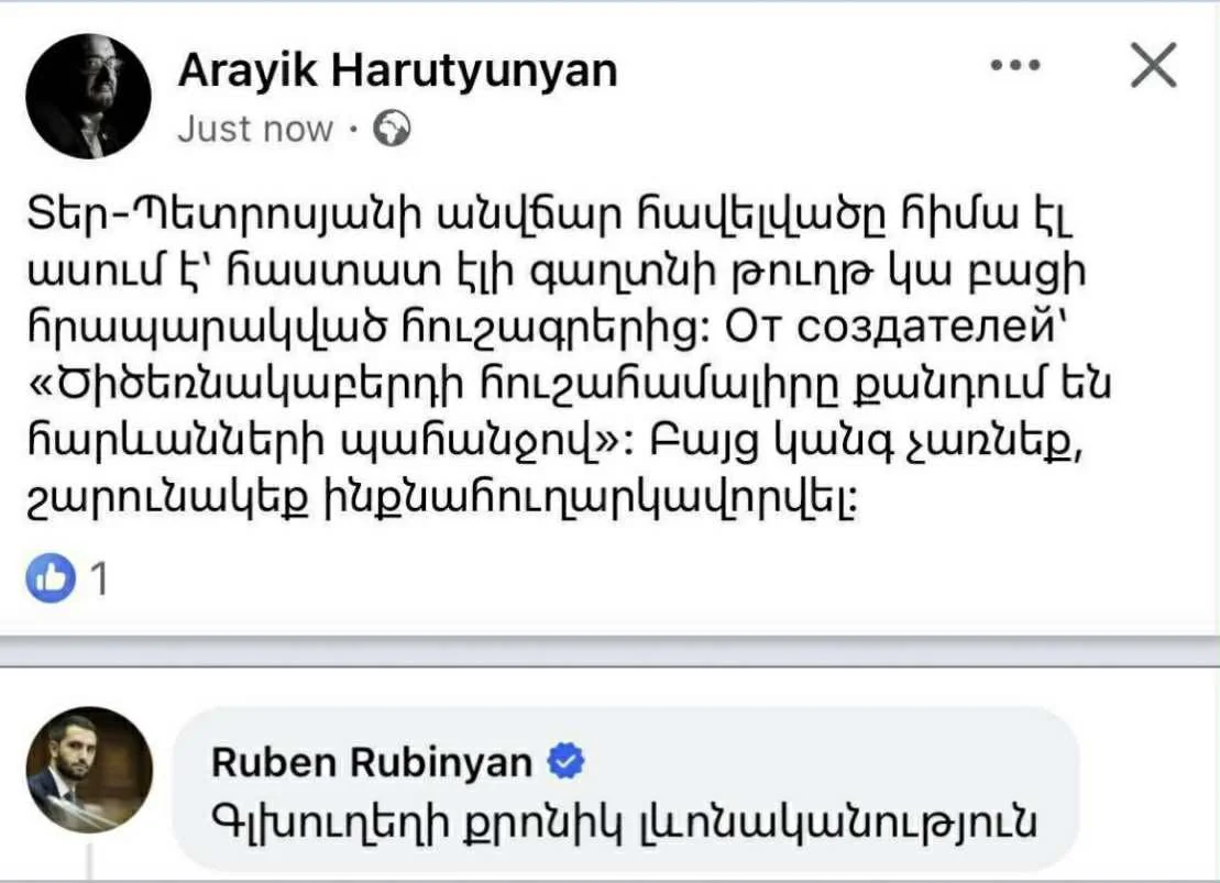 «Կաառավարությունը-Ես-Եմ»-Նիկոլը (առաջ կար Կրակեմ-Հրաչը կամ Գյուլեմ-Սուրոն, հիմա մի նոր երևույթ ա ձևավորվել) ոնց-որ շատ ա նեղված մեր վերջին բացահայտումներից, իրա тяжёлы արտիլերիան հանել ա ստատուս գրելու գործի: