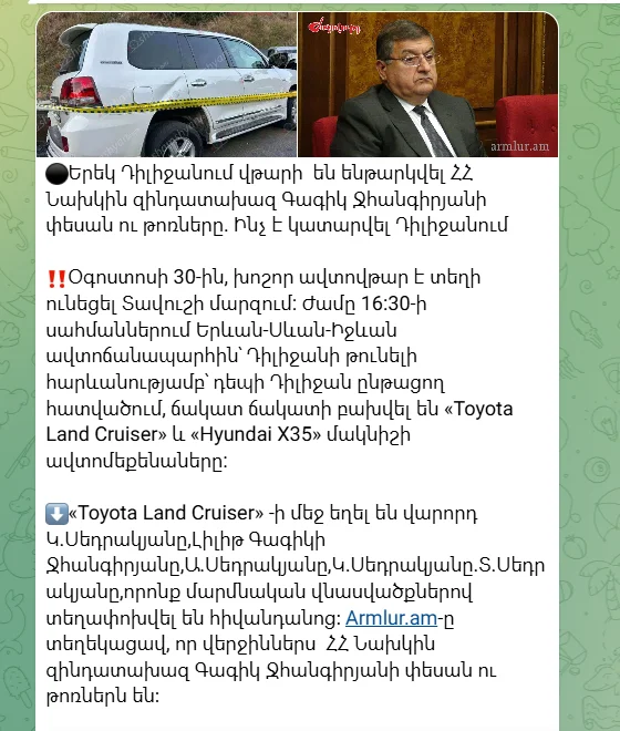 Ըստ կայքի՝ օգոստոսի 30-ին ժամը 16:30-ի սահմաններում Երևան-Սևան-Իջևան ավտոճանապարհին՝ Դիլիջանի թունելի հարևանությամբ՝ դեպի Դիլիջան ընթացող հատվածում, ճակատ ճակատի բախվել են «Toyota Land Cruiser» և «Hyundai X35» մակնիշի ավտոմեքենաները: