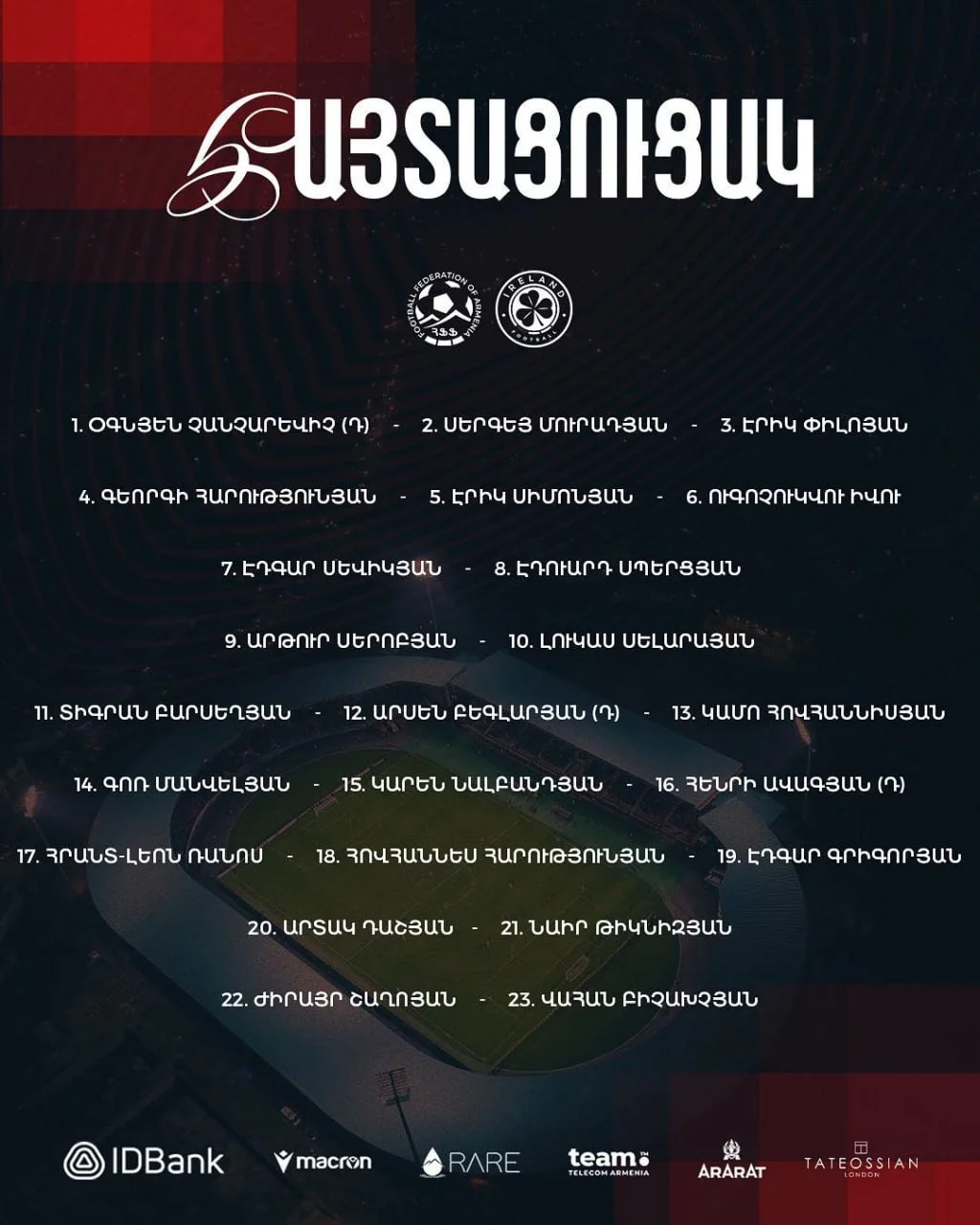 Ներկայացվել է Հայաստանի ազգային հավաքականի վերջնական հայտացուցակը՝ Իռլանդիայի հետ հանդիպմանը։