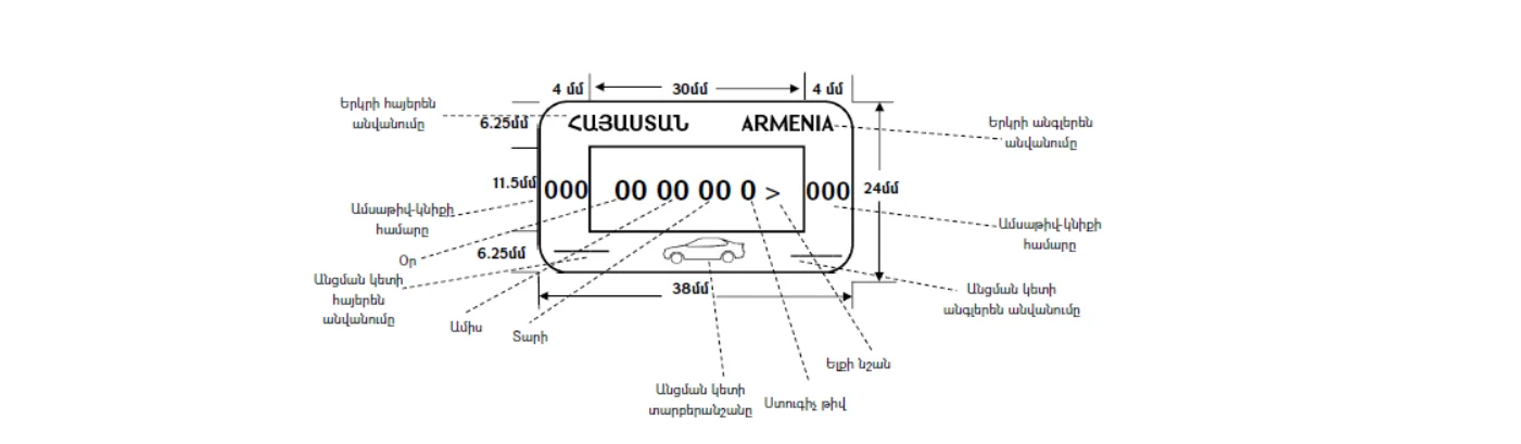 «Ամսաթիվ-կնիքի վրա հայերենով և անգլերենով նշվում են «ՀԱՅԱՍՏԱՆ», «ARMENIA» բառերը, պետական սահմանի անցման կետի անվանումը, պետական սահմանը հատելու օրը, ամիսը և տարեթիվը, ստուգիչ թիվը, ելքի կամ մուտքի նշանը, ամսաթիվ-կնիքի համարը, ինչպես նաև պատկերված են համապատասխանաբար` օդային, երկաթուղային կամ ավտոմոբիլային անցման կետերի տարբերանշանները։»,