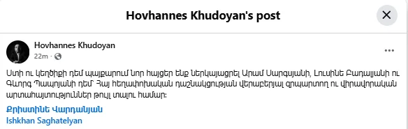 Ստի ու կեղծիքի դեմ պայքարում նոր հայցեր ենք ներկայացրել Արամ Սարգսյանի, Լուսինե Բադալյանի ու Գևորգ Պապոյանի դեմ` Հայ հեղափոխական դաշնակցության վերաբերյալ զրպարտող ու վիրավորական արտահայտություններ թույլ տալու համար: Այս մասին Ֆեյսբուքի իր էջում գրել է փաստաբան Հովհաննես Խուդոյանը։