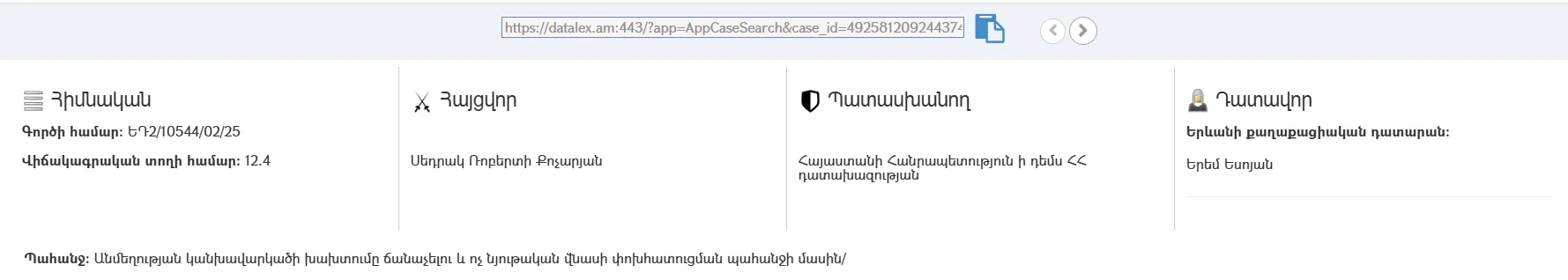 Նշենք, որ գործը մակագրվել է Երևանի քաղաքացիական դատարանի դատավոր Երեմ Եսոյանին։