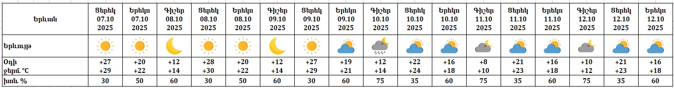 Երևան քաղաքում հոկտեմբերի 7-ի ցերեկը, 8-9-ը, 11-12-ը սպասվում է առանց տեղումների եղանակ։ Հոկտեմբերի 10-ի գիշերը և առավոտյան հնարավոր է կարճատև անձրև: