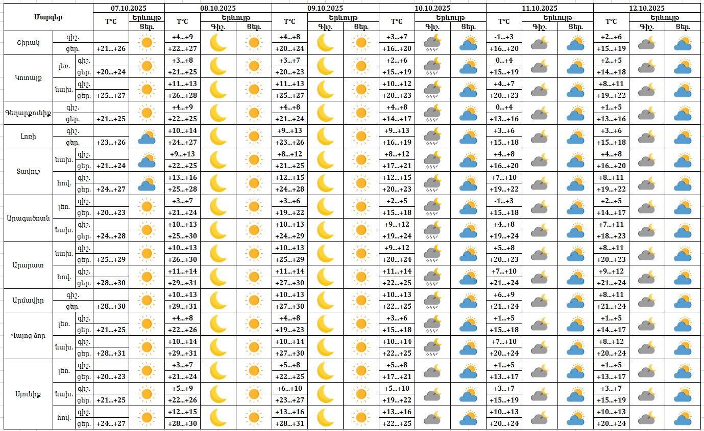 Հանրապետության տարածքում հոկտեմբերի 7-ի ցերեկը, 8-9-ը, 11-12-ը սպասվում է առանց տեղումների եղանակ։ Հոկտեմբերի 10-ի գիշերը և առավոտյան առանձին շրջաններում սպասվում է կարճատև անձրև։