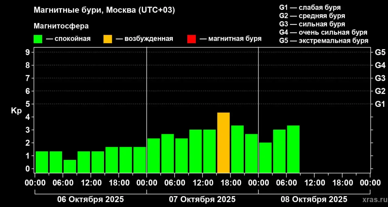 Ռուսաստանի Գիտությունների ազգային ակադեմիայի մասնագետները հայտնել են, որ հոկտեմբերի 8-ին պահպանվելու է գեոմագնիսական խանգարումների և թույլ մագնիսական փոթորիկների հավանականությունը։