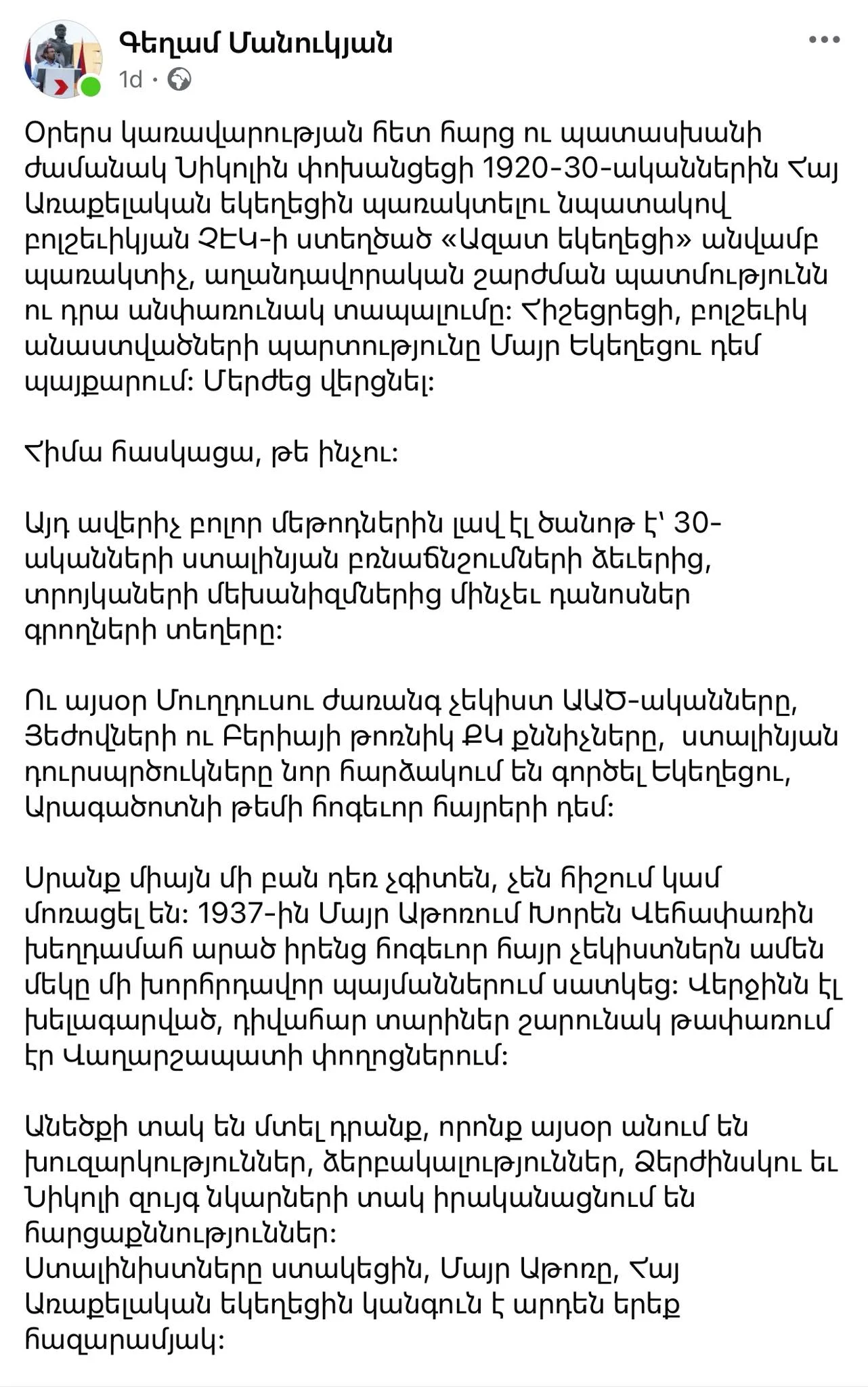 ՀՅԴ Հայաստանի ԳՄ անդամ, ՀՀ ԱԺ «Հայաստան» խմբակցության պատգամավոր Գեղամ Մանուկյանը գրում է․