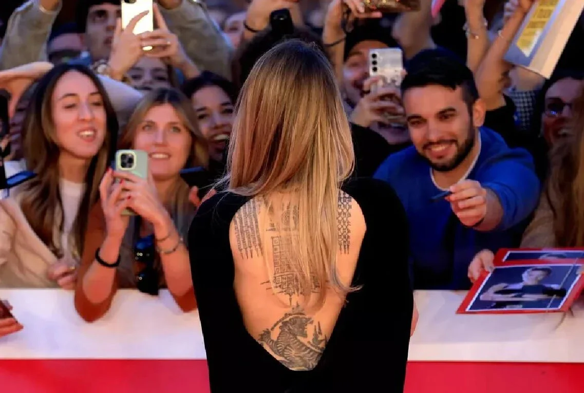 Հռոմում իր նոր «Կուտյուր» ֆիլմի պրեմիերային Անջելինա Ջոլին կարմիր գորգով քայլեց էլեգանտ սև թիկնոցով զգեստով՝ աքսեսուարներով՝ սրածայր կրունկներով կոշիկներով, էլեգանտ ականջօղերով և նուրբ դիմահարդարմամբ։ Հատկապես ուշադրություն գրավեցին դերասանուհու մեջքի դաջվածքները, որոնք նա հազվադեպ է ցուցադրում հանրության առջև։
