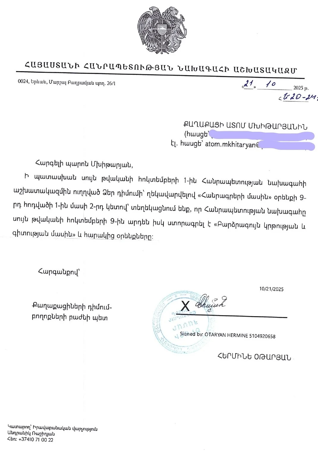 Նա հրապարակել է նախագահի աշխատակազմի պաշտոնական պատասխանը, որ կազմվել է հոկտեմբերի 21-ին:
