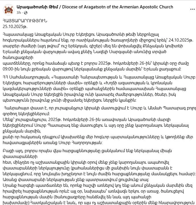 «Կանցնեն տարիներ, և ամեն ոք ու ամեն ինչ իր անունը կստանա։ Այդ ժամանակ բոլորին պարզ կլինի, որ հենց այս օրերին Հայոց Եկեղեցու Արագածոտնի թեմի հոգևորականներն ու նրանց առաջնորդը փառահեղ նոր էջեր են գրել մեր ժողովրդի ազգային և հոգևոր պայքարի պատմության մեջ։