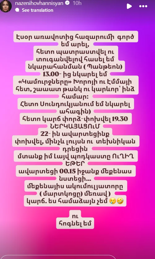«Էսօր առավոտից հազար ու մի գործ եմ արել, հետո պատրաստվել ու տուգանվելով հասել նկարահանման»,– գրել է դերասանուհին։