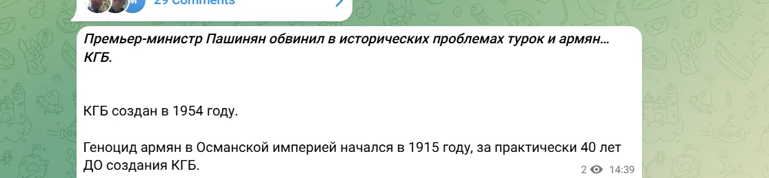 «Վարչապետ Փաշինյանը թուրքերի և հայերի պատմական խնդիրների համար մեղադրել է... «КГБ»-ին (հայերեն՝ Պետական անվտանգության կոմիտե, ՊԱԿ – խմբ․)։