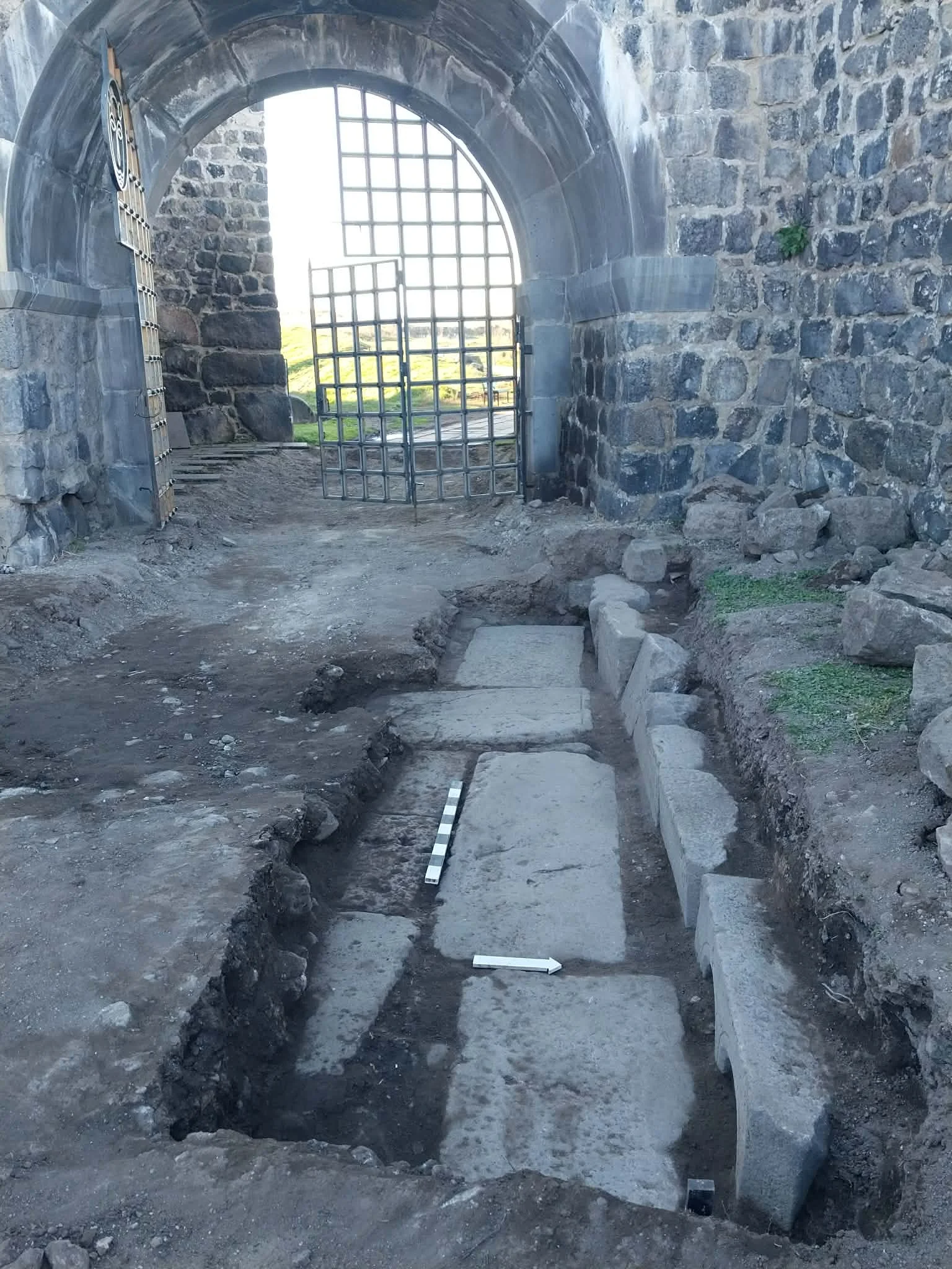Հատկապես ուշագրավ են պեղումները պարսպի մուտքի մոտ, որտեղ հետախուզական աշխատանքների ընթացքում ի հայտ են եկել միջնադարյան ճանապարհ՝ շարված սալաքարերով, տապանաքարերով, ինչպես նաև այդ ճանապարհի եզրաքարերը, որտեղ նույնպես օգտագործված են մեծ թվով զանազան կոթողների, այդ թվում՝ որմնակամարներով պատվանդանի հետաքրքիր բեկորներ։