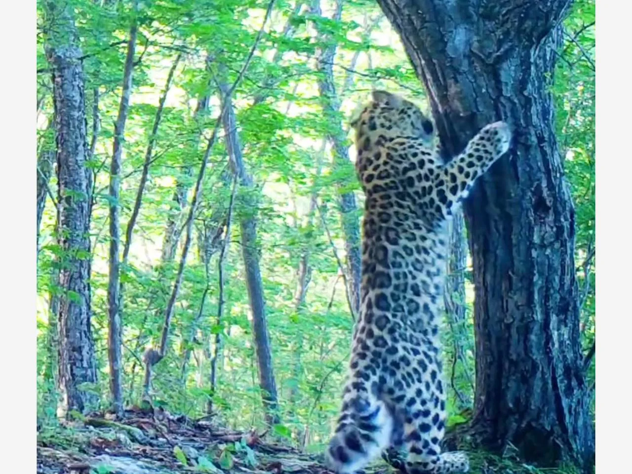 Զբոսաշրջիկների խումբը, գիդ Անտոն Գանզևիչի գլխավորությամբ, ֆոտախցիկը տեղադրել էր կենդանու հաճախ այցելվող տարածքում։ Կադրերում երևում է, թե ինչպես է ընձառյուծը մոտենում ծառին՝ ուսումնասիրելով այնտեղ մնացած հոտային հետքերը, այնուհետև բարձրանում է հետին թաթերին՝ փորձելով ավելի լավ հոտոտել։