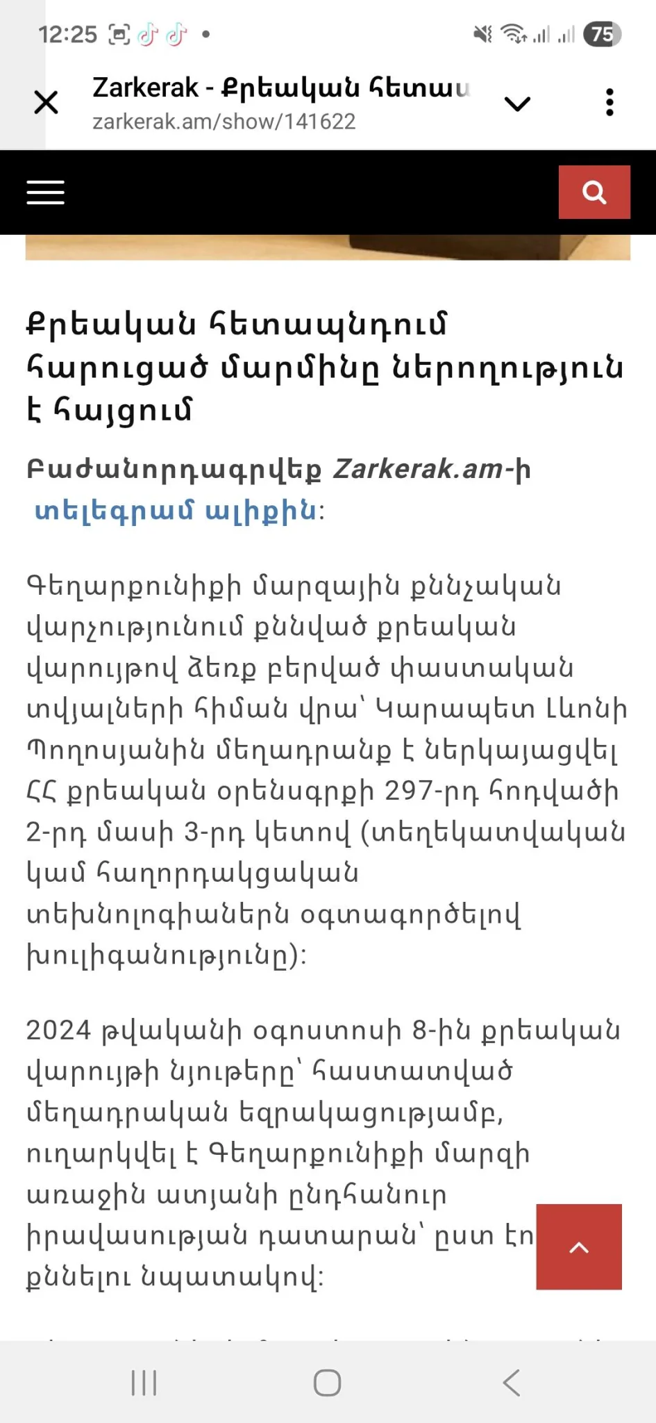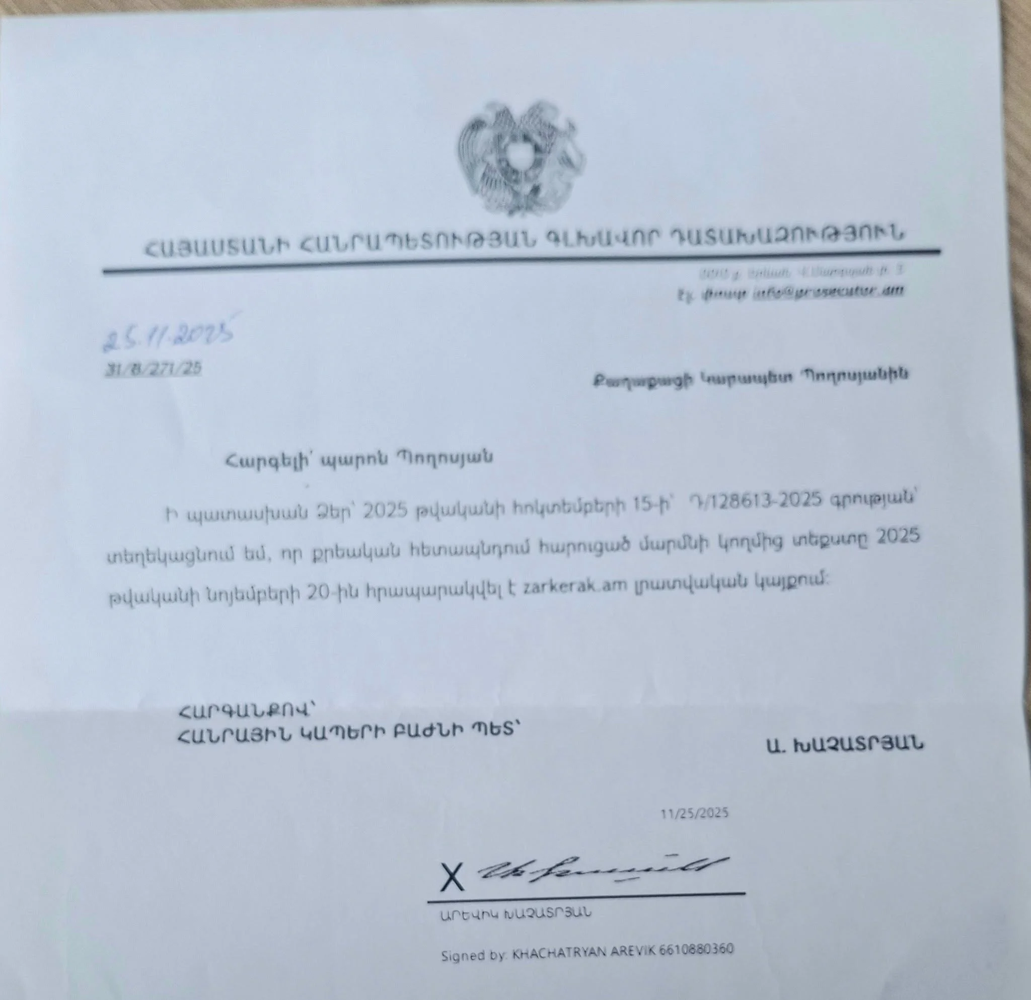 ՀՀ դատախազությունը հրապարակային ներողություն է խնդրում ինձանից 2024թ հունիսի 5֊ին, ինձ ապօրինի ձերբակալելու, կալանավորելու, ութ ամիս շարունակ իմ խոսքի ազատությանը խոչընդոտելու համար։