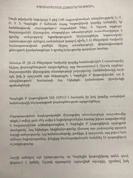 Նոյեմբերի 27-ին Մայր Աթոռից հայտարարություն էին տարածել, որտեղ նշված էր, որ պատարագների ժամանակ կաթողիկոսի անունը զեղչելու գործողությունները ենթակա են խստագույն պատժի, եթե եկեղեցականը չզղջա և չսրբագրի իր հակականոնական ընթացքը սահմանված կարգով։