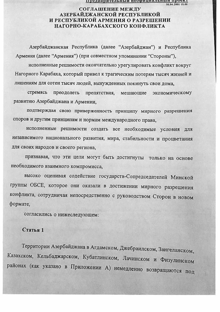 Նիկոլ Փաշինյանը երեկ հրապարակել է «Ղարաբաղյան հակամարտության կարգավորման բանակցային գործընթացի փաստաթղթերը», ավելի ճիշտ՝ փաստաթղթերի մի մասը։ Քի Վեսթի փաստաթուղթը չկար։ Փոխարենը ներկայացվել էր Նիկոլ Փաշինյանի ընտանիքին պատկանող «Հայկական ժամանակ» օրաթերթից մի քաղվածք։ Այսօր առավոտյան Ազգային ժողովում Նիկոլ Փաշինյանը պնդեց, որ այդ փաստաթուղթն իրենք չունեն։ Քանի որ Մինսկի խմբի և գործընթացի էջը ԵԱՀԿ-ն փակել է, բոլոր փաստաթղթերը գաղնտազերծվել են (այս վերջին հաստատումը Նիկոլ Փաշինյանը կառավարության հետ հարցուպատասխանի ժամանակ չհերքեց) թույլ տվեք ես էլ հրապարակեմ իմ անձնական արխիվում շա՜տ երկար տարի գտնվող մի փաստաթուղթ (դրանից մի հատված)։ Այդ փաստաթուղթը ես պահել եմ ավելի քան 20 տարի։