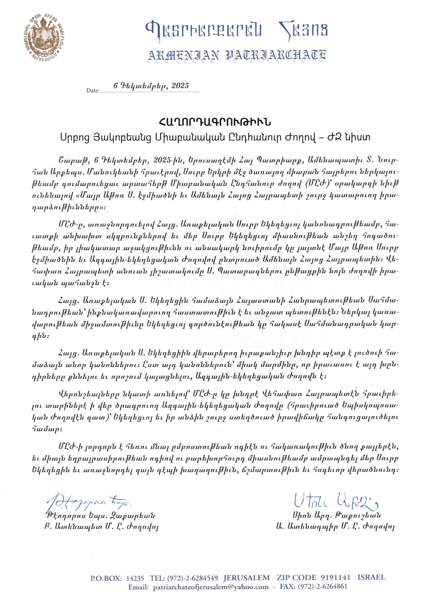 Երուսաղեմի միաբանները լիակատար աջակցություն են հայտնում Մայր աթոռ Սուրբ Էջմիածնին և Ազգային եկեղեցական ժողովով ընտրված Ամենայն հայոց հայրապետին: Ընդգծվում է՝ վեհափառ հայրապետի անվան հիշատակումը սուրբ պատարագների ընթացքում նույն ժողովի իրավական պահանջն է: