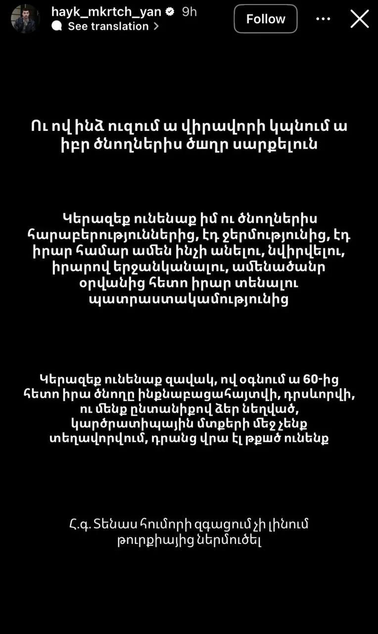«Ուրախ եմ, որ ինչքան չկայացած մարդ կա փորձումա իմ՝ կայացած կնոջ կերպարի վրա կոնտենտ ստեղծի։ Ձեր նմանները միշտ գալիս ու գնում են։ Մարդ, որ իր սեփական ծնողներինա ծաղր ու ծանակի ենթարկում, էլ ինչ սպասես էդ մարդուց»։