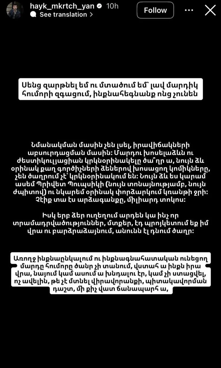 Առողջ ինքնաընկալում ու ինքնագնահատական ունեցող մարդը հումորը ծանր չի տանում, վստահ ա ինքն իրա վրա, նայում կամ ասում ա խնդալու էր, կամ չի ստացվել, ոչ ավելին, թե չէ մտնել վիրավորանքի, պիտակավորման դաշտ, մի քիչ վատ ճանապարհ ա»,– գրել է բլոգերը։