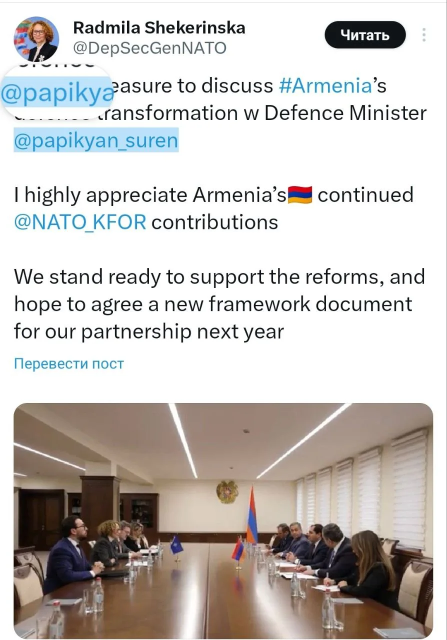 «Հաճելի էր քննարկել հանրապետության պաշտպանության վերափոխումը։ Մենք պատրաստ ենք աջակցել բարեփոխումներին և հույս ունենք հաջորդ տարի համաձայնության գալ մեր գործընկերության նոր շրջանակային փաստաթղթի շուրջ», - գրել է նա։