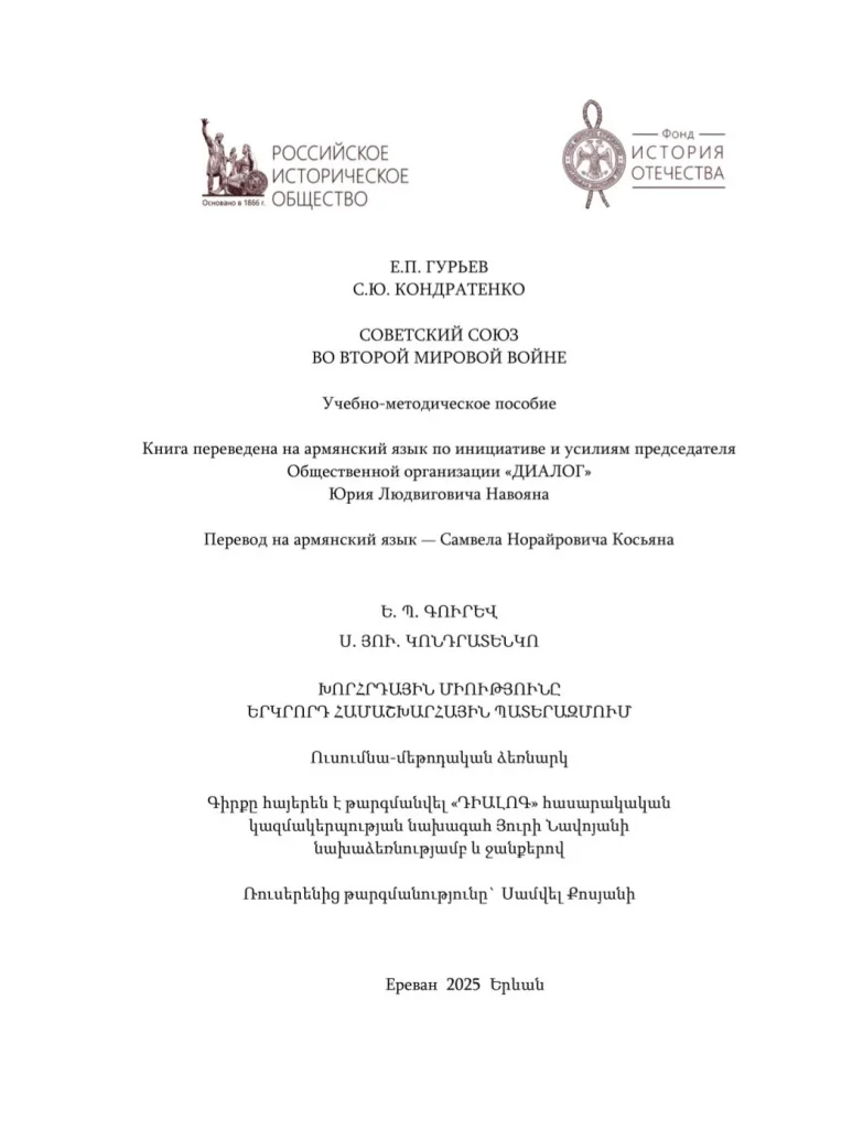 Символическим и содержательным завершением мероприятий, посвященных 80-летию Великой Победы, для организации «ДИАЛОГ» стал перевод на армянский язык учебно-методического пособия «Советский Союз во Второй мировой войне». Книга, созданная и изданная Российским историческим обществом при поддержке фонда «История Отечества», переведена на армянский язык по инициативе и при содействии председателя общественной организации «ДИАЛОГ» Юрия Навояна. Перевод выполнен писателем Самвелом Косяном.