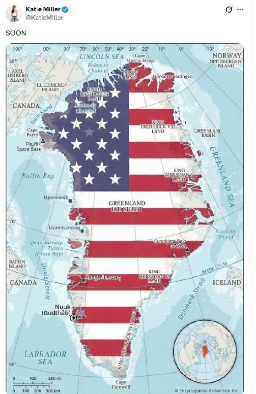 Սպիտակ տան քաղաքականության գծով աշխատակազմի ղեկավարի տեղակալ Սթիվեն Միլլերի կինը՝ Քեյթի Միլլերը, հրապարակել է Գրենլանդիայի քարտեզը՝ ներկված ամերիկյան դրոշի գույներով։ Հաղորդագրությունը հրապարակվել է նրա X սոցիալական ցանցի էջում։
