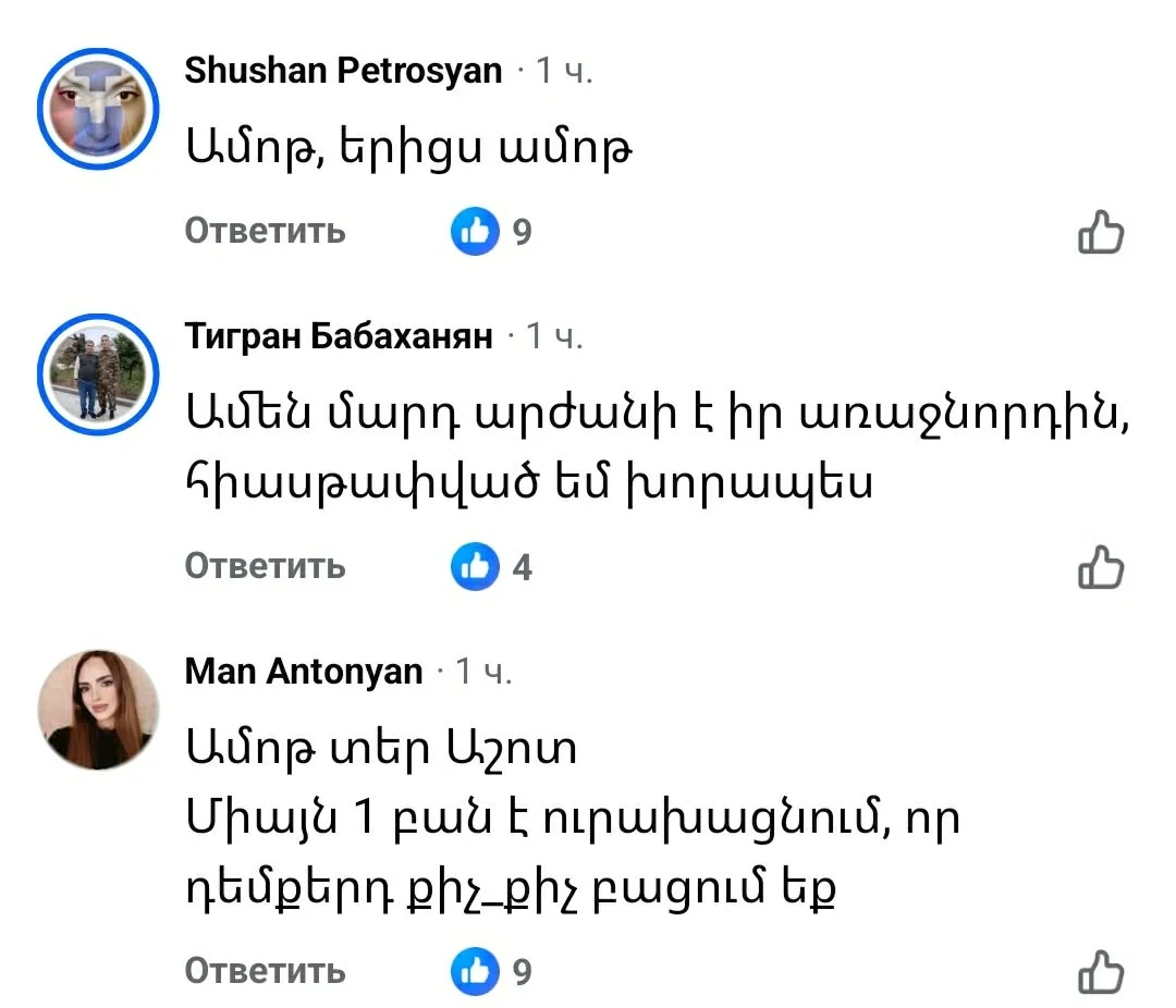 Փաշինյանին միացած Տեր Աշոտ քահանա Սաֆարյանի գրառման մեկնաբանության բաժնում ամոթանք է տվել նրան Շուշան Պետրոսյանը․ «Ամոթ, երիցս ամոթ»,– գրել է երգչուհին։