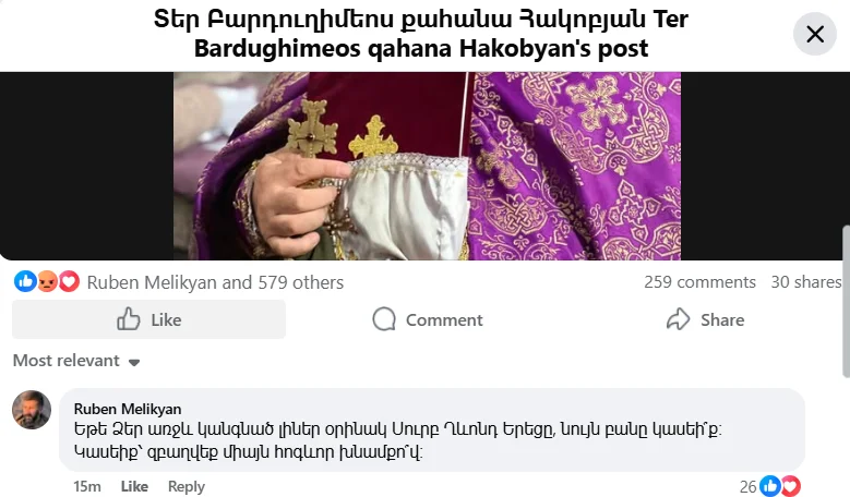 Տեր Բարդուղիմեոս քահանա Հակոբյանի՝ Կաթողիկոսի դեմ ուղղված գրառմանն արձագանքել է իրավապաշտպան Ռուբեն Մելիքյանը՝ նշելով․ «Եթե Ձեր առջև կանգնած լիներ օրինակ Սուրբ Ղևոնդ Երեցը, նույն բանը կասեի՞ք։ Կասեիք՝ զբաղվեք միայն հոգևոր խնամքո՞վ»։