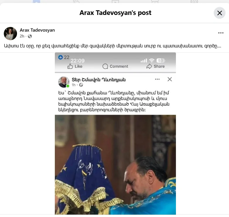 Լրագրող Արաքս Թադևոսյանը կիսվել է Տեր Շմավոն Ղևոնդյանի գրառմամբ, որը, հիշեցնենք, միացել է Նիկոլ Փաշինյանի և 10 տիրադավների կողմից ընդունված՝ «Հայաստանի Առաքելական Սուրբ Եկեղեցու բարեկարգման» վերաբերյալ հայտարարությանը։