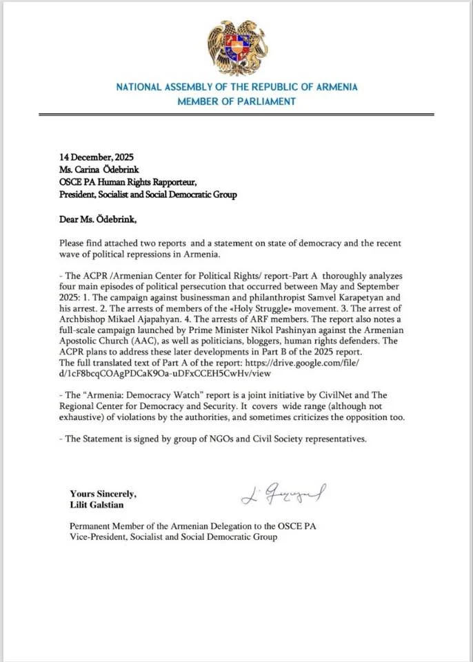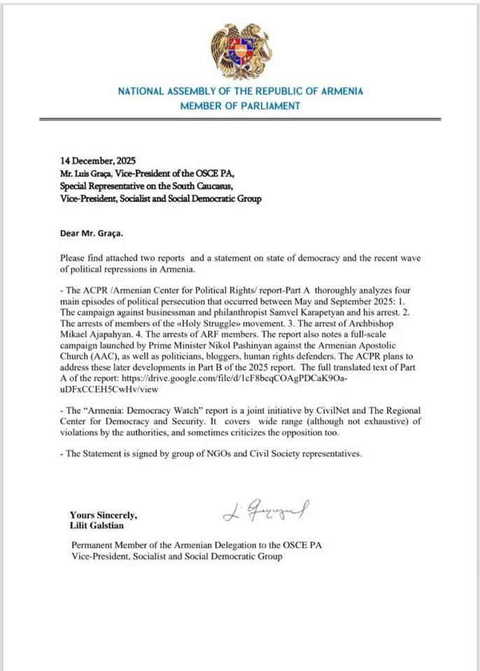ՀՅԴ Բյուրոյի անդամ, ԱԺ «Հայաստան» խմբակցության պատգամավոր Լիլիթ Գալստյանը ԵԱՀԿ ԽՎ-ում Հայաստանի պատվիրակության մշտական/ընդդիմադիր անդամ, խորհրդարանական վեհաժողովի փոխնախագահ, տարածաշրջանի զեկուցող Լուիշ Գրացիային և ԵԱՀԿ ԽՎ Մարդու իրավունքների հարցերով զեկուցող Կարինա Օդեբրինքին նամակներ է ուղարկել: