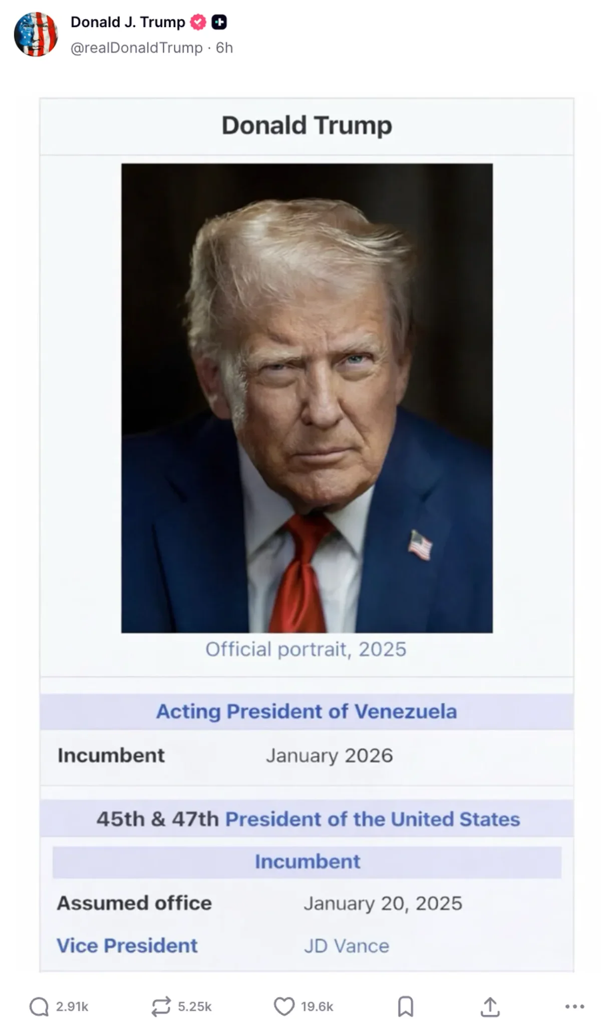 ԱՄՆ նախագահ Դոնալդ Թրամփը իր «Truth» սոցիալական ցանցի էջում գրառում է արել, որում, հավանաբար կատակով, իրեն անվանել է «Վենեսուելայի նախագահի պաշտոնակատար»։